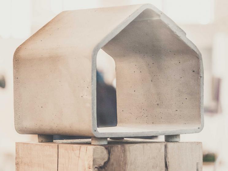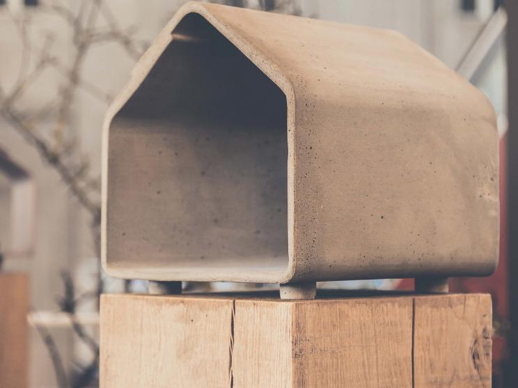 Dit strakke voederhuisje in flinterdun design beton is een technisch hoogstandje.