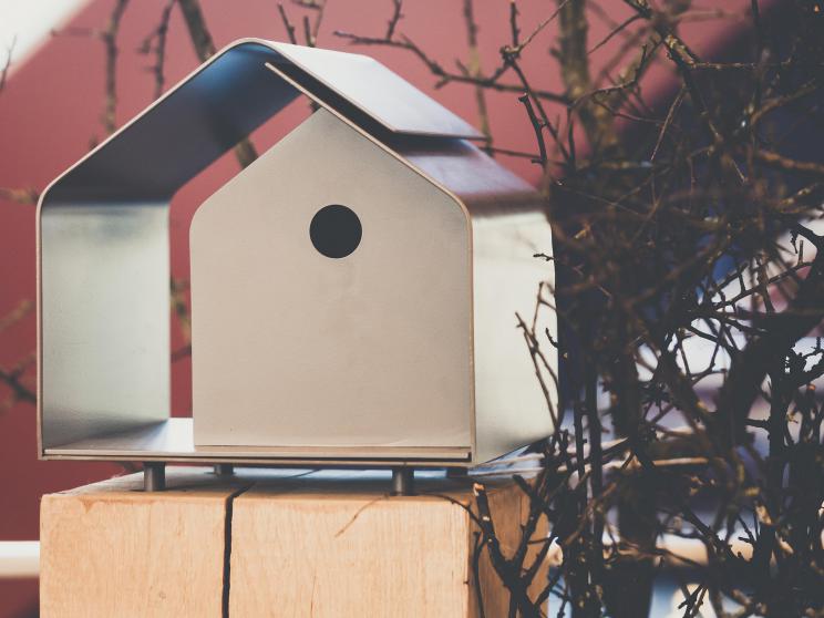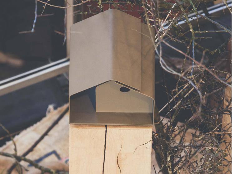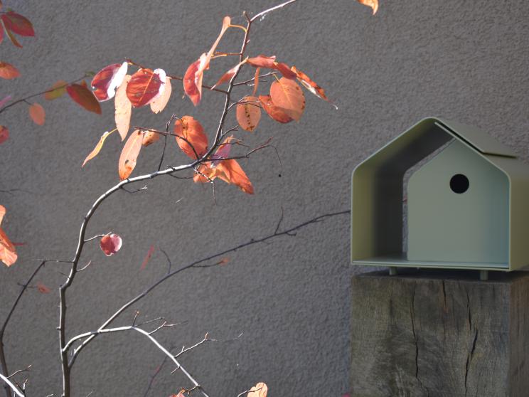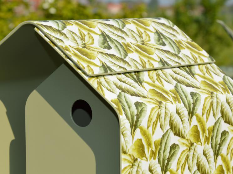 Dit strakke voederhuisje in gelakt aluminium is een eigen ontwerp. Deze 'limited edition' heeft een afwerking met een digitale print.